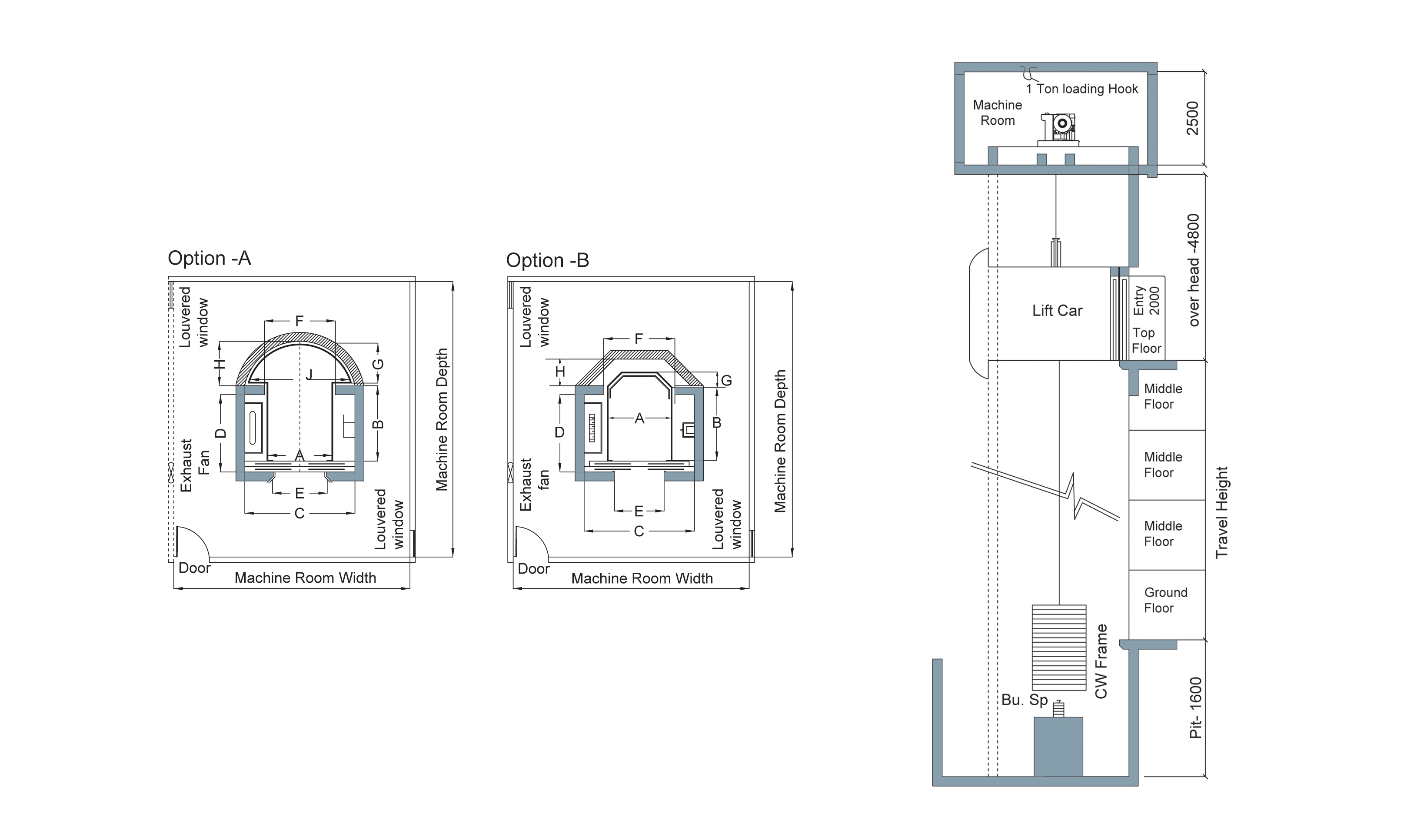 يمكن أن تعمل هذه المصاعد بنظام الجر أو النظام الهيدروليكي حسب موقع غرفة الماكينات